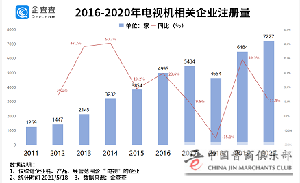 从近十年电视机相关企业发展状况来看,数据显示,近两年企业注册量显著增多,其中2019年全年注册量突破6000家,2020年是近十年企业注册的高峰期,注册量为7227家,同比增长了11.5%。