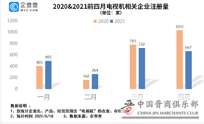 数据显示,2021年前4月,我国电视机相关企业注册量为2148家,同比下降9.6%。其中,3、4月份注册量分别为722家、667家,均呈同比下降趋势。