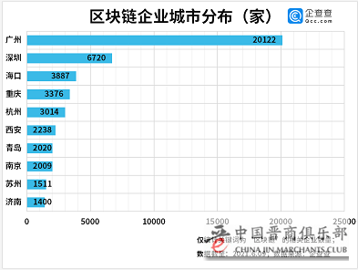 从城市分布来看,广州市的区块链产业较为密集,共有相关企业2.01万家,占广东省所有企业总数的69%。深圳以6720家相关企业数量紧随其后,海口、重庆、杭州则分别有相关企业3887家、3376家和3014家,排名前五位。