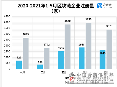 2021年截至五月底共注册区块链企业15621家,同比增长155%。2021年五月共注册区块链企业3375家,同比增长105%,环比减少15%,整体呈上升趋势。