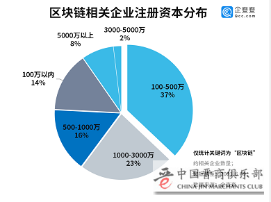 从注册资本来看,注册资本在100-500万元的区块链企业数量最多,占比高达37%,注册资本在1000-3000万元和500-1000万元的分别占23%和16%。
