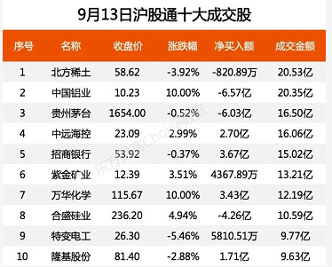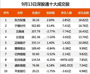 9月13日,北向资金当日成交净买额为-38.24亿元。其中,沪股通当日成交净买额为-5.92亿元;深股通当日成交净买额为-32.33亿元。