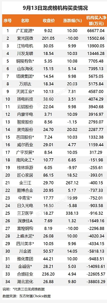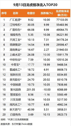 9月13日,上榜龙虎榜个股中,资金净流入最多的是广汇能源,3日净流入7.71亿元。数据显示,该股日内涨停收盘,近3日累涨25.28%。具体看,沪股通3日净买入2.14亿元。