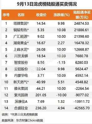 陆股通参与龙虎榜中个股共涉及14股,其中10股被陆股通净买入,塔牌集团被买入最多,3日净买入2.49亿元。另外4股被陆股通净卖出,合盛硅业被卖出最多,为4.26亿元。