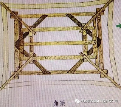 递角梁是指建筑物拐角部分的斜梁。与面宽、进深各呈45度。