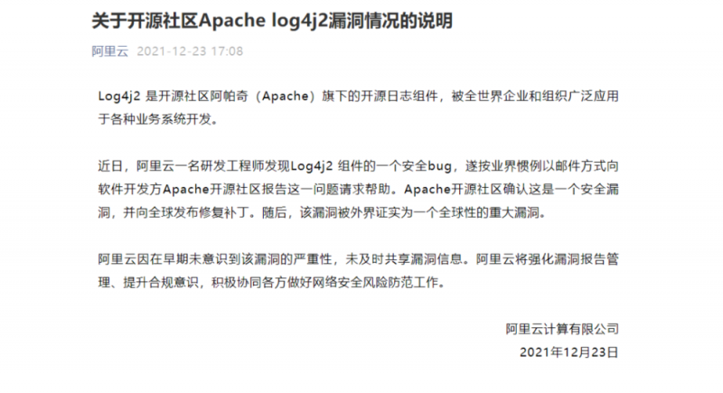 12月23日晚间,阿里云通过官方微信公号发布了声明,称“因在早期未意识到该漏洞的严重性,未及时共享漏洞信息”,并强调将强化漏洞管理、提升合规意识。
