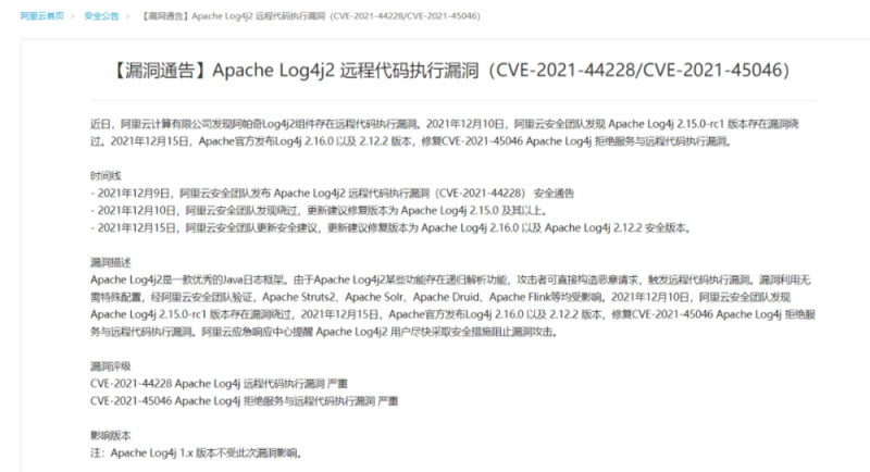 而阿里云官网则于12月9日晚11时左右发布漏洞通告,称安全团队发现Apache Log4j 2.15.0-rc1版本存在漏洞绕过,要求用户及时更新版本,并向用户介绍该漏洞的具体背景及相应的修复方案。