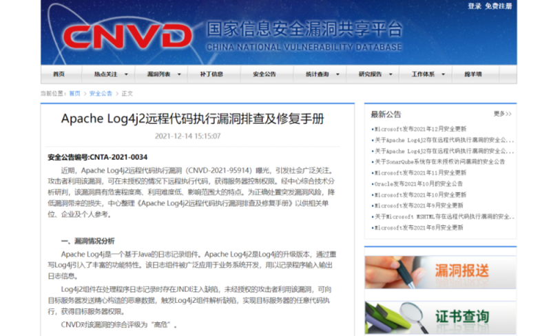 12月14日中国国家信息安全漏洞共享平台发布的《Apache Log4j2远程代码执行漏洞排查及修复手册》截图。