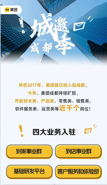 据悉,美团在成都将形成以软件类研发、信息化系统、后台运营系统、CRM为主的明确业务定位。主要招聘业务均为美团核心业务,例如外卖、零售、到店餐饮、基础研发、服务体验等。其中,CRM业务和餐饮SaaS业务全链路在当地闭环,大部分业务的产品、前端、后端、测试能够闭环在成都完成协作,具有较强的独立性。同时,美团配套的培养体系、文化社团等都在成都是同样的配置。