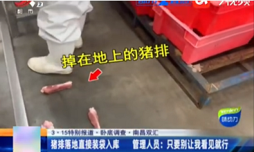 此前,南昌双汇因食品卫生问题被媒体曝光。从媒体发布的视频看,南昌双汇生产车间存在猪排落地直接装袋入库、消毒环节太随意、风淋系统形同虚设等问题。