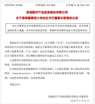 1月29日,览海医疗发布一则公告称,近日收到董事长密春雷的授权书,授权公司董事倪小伟代为履行董事长职责,代行期限3个月。