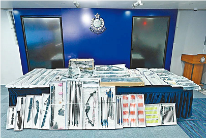此外,警方还查获了气枪、斧头、开山刀、剑、弩、弓箭等大量攻击性武器,其中刀剑均已开锋,弓箭则带有钢制箭头。警方还查获了总值38万港元的现金,且其中大部分为外币。