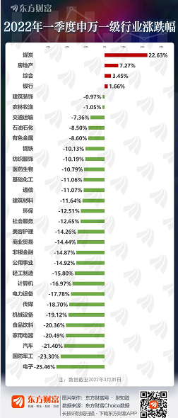 从行业指数看,申万一级31个行业中,首季度有4个板块收涨,煤炭行业涨幅居首,达22.63%。其后为房地产、综合和银行板块,年内分别上涨7.27%、3.45%和1.66%。此外,27个行业收跌,其中电子、国防军工、家用电器、汽车和食品饮料行业在本季度跌幅居前,且回调幅度均超20%,依次为-25.46%、-23.30%、-21.40%、-20.49%、和-20.36%。
