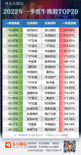 累计跌幅方面,退市新亿、*ST长动和*ST艾格本季跌幅位居前三,累计跌幅依次为-74.38%、-64.60%和-62.67%。统计一季度熊股前20发现,行业多聚焦在电子(4只)、传媒(3只)和电力设备(3只)板块。
