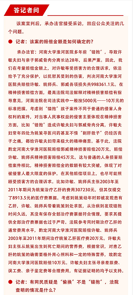 4月28日,河南省开封市鼓楼区人民法院对许敏、姚师兵、郭威诉河南大学淮河医院侵权及许敏、姚师兵要求杜新枝承担连带赔偿责任纠纷一案作出一审判决:河南大学淮河医院赔偿许敏、姚师兵精神损害赔偿、医疗费、误工费、交通住宿费、鉴定费等各项费用共计798361.1元;赔偿郭威精神损害赔偿200000元;驳回许敏、姚师兵、郭威对河南大学淮河医院的其他诉讼请求;驳回许敏、姚师兵对杜新枝的诉讼请求。