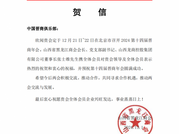 山西省黑龙江商会向2024第十四届晋商年会发来贺信