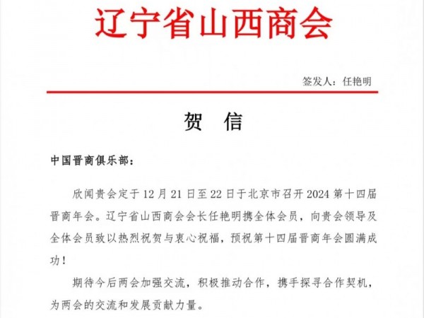 辽宁省山西商会向2024第十四届晋商年会发来贺信