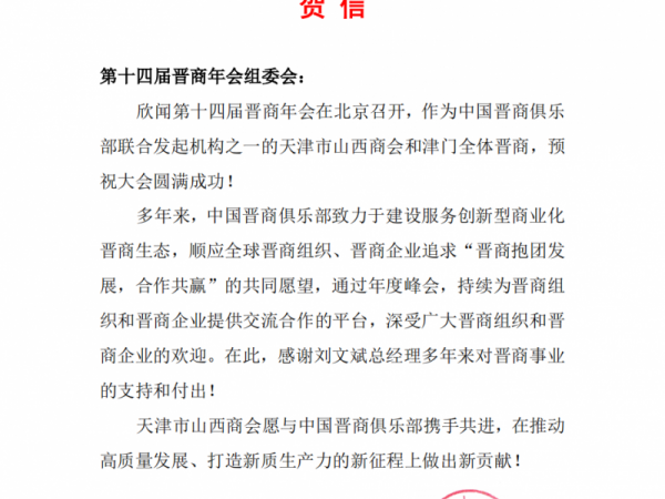 天津市山西商会向2024第十四届晋商年会发来贺信