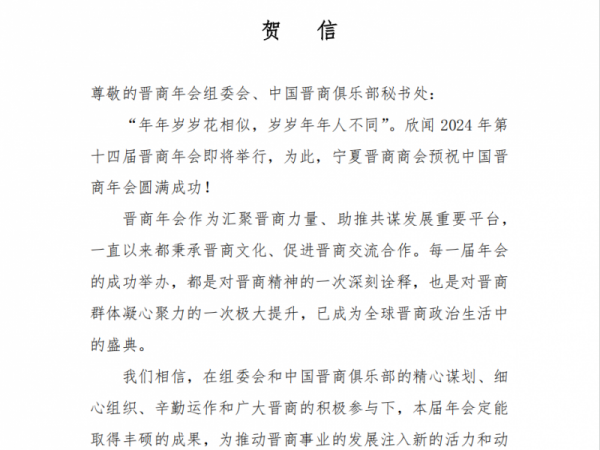 宁夏晋商商会向2024第十四届晋商年会发来贺信