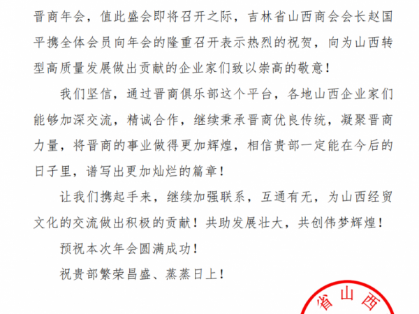 吉林省山西商会向2024第十四届晋商年会发来贺信