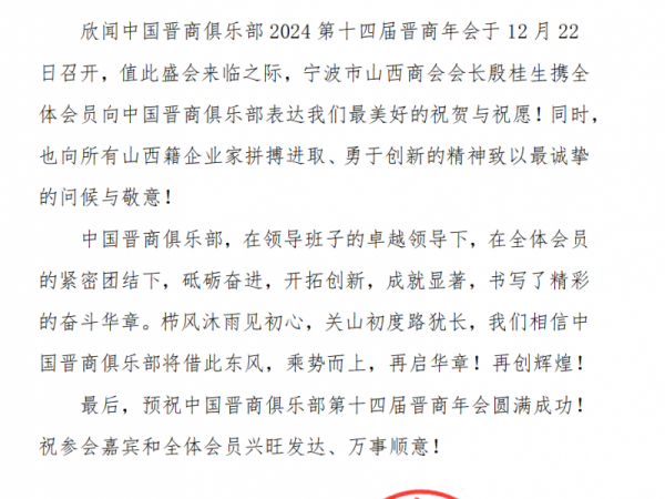 宁波市山西商会向2024第十四届晋商年会发来贺信
