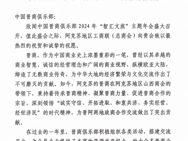 新疆维吾尔自治区阿克苏地区工商联(总商会)向2024第十四届晋商年会发来贺信