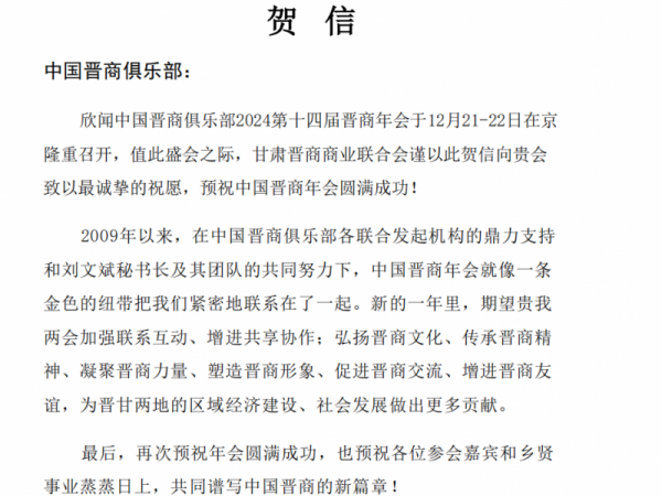 甘肃晋商商业联合会向2024第十四届晋商年会发来贺信