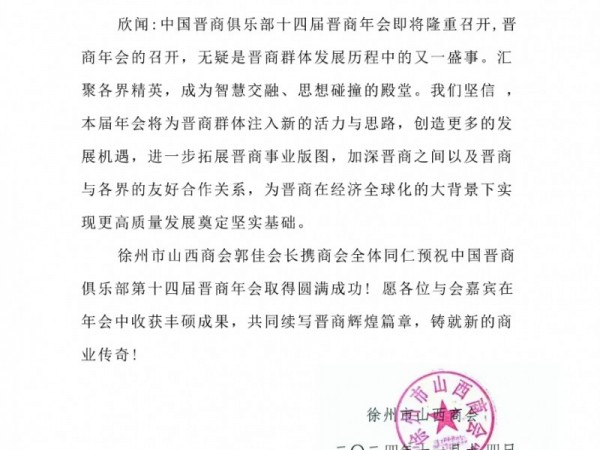 徐州市山西商会向2024第十四届晋商年会发来贺信