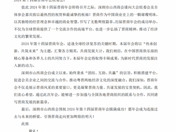 深圳市山西商会向2024第十四届晋商年会发来贺信