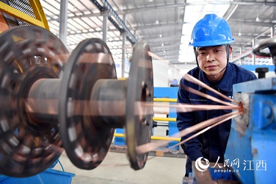 近年来,江西省丰城市招商引资变“来者皆有意”为“精挑细选”,为发展升级注入强劲动力。图为循环经济产业园一家再生铜加工企业内,工人正在生产线上操作。人民网 时雨摄