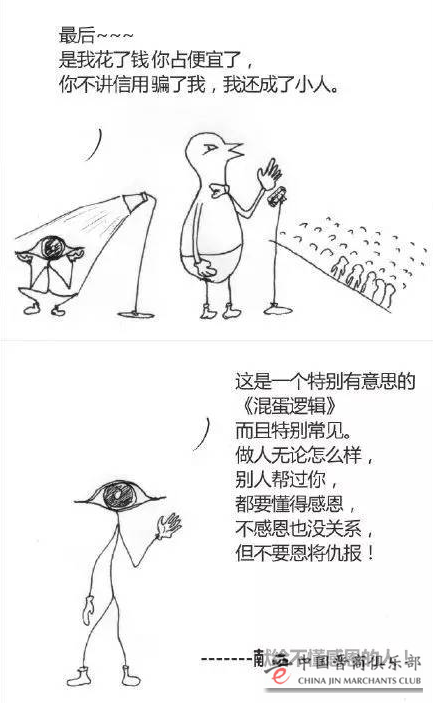 还有一种人,你每天给他一个鸡蛋,只要一天不给他,就会抱怨你,甚至对你充满愤恨。他忘记了,其实你并不欠他鸡蛋,你给他是情分,你不给是本分。这样的人就该每天给他一个耳光,如果哪天忘了给,他就会万分感激你。