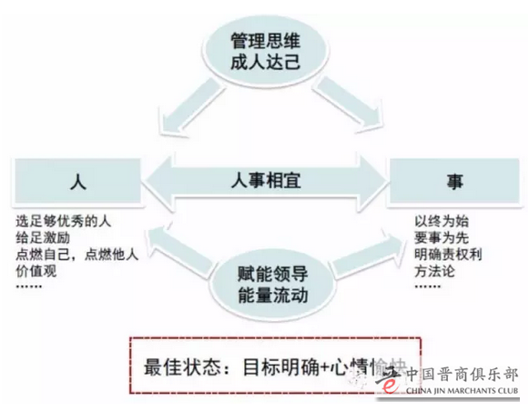 一个企业,如果人和事能非常完美的结合起来,企业就能做好。接下来上面支撑的是管理思维,成人达己;下面支撑的是赋能领导,能量流动,不仅要有术上的东西,还要有道上的东西。最佳状态就是八个字:目标明确+心情愉快。