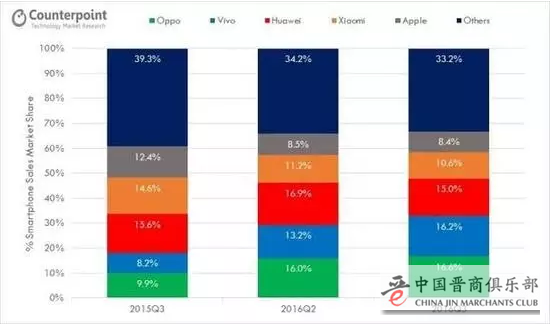 10月25日,市场研究机构Counterpoint Research发布的今年第三季度中国智能手机市场数据显示,OPPO市场占有率达到创纪录的16.6%,排名第一。