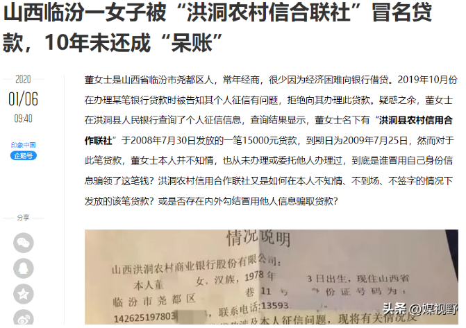 文章披露:山西省临汾市尧都区的董女士,常年经商,很少因为经济困难向银行借贷。2019年10月份在办理某笔银行贷款时,被告知其个人征信有问题,拒绝向其办理此贷款。疑惑之余,董女士在洪洞县人民银行查询了个人征信信息,查询结果显示,董女士名下有“洪洞县农村信用合作联社”于2008年7月30日发放的一笔15000元贷款,到期日为2009年7月25日。