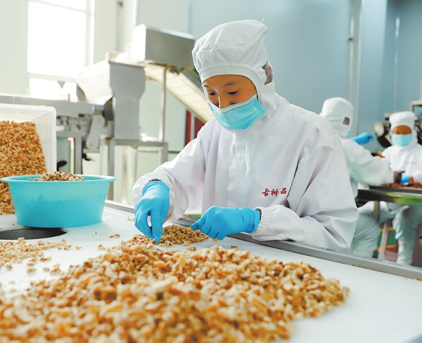 近年来,古县依托核桃资源优势,按照“科研院校+龙头企业+合作社+基地+农户+市场”的特色产业发展模式,通过龙头企业的带动,全力推动“古岳古树”核桃品牌快速发展,不断提高农业生产综合效益,为全县经济高质量发展积蓄强大动能。图为该县古树食品有限公司的工人正在加工核桃。