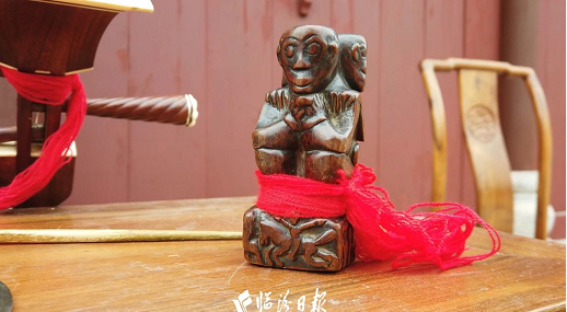 旁边横放一张条桌,桌上放一枣木雕刻而成的坐猴醒木,只见“说书人”左脚蹬甩板,以此击节,右膝上绑一扇小钗打花填空,怀抱三弦,边弹边唱边打小钗,带有浓厚三弦乡音的板腔声赫然响起。