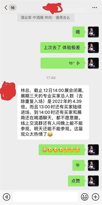 据中酒展组委会透露,截止3月12日14点展会闭幕,展期三天的专业买家总人数(去除重复入场)是2022年的4.39倍。无论是展商还是观众,三年来被压抑的交流、合作需求都在这三天里得以尽情释放。