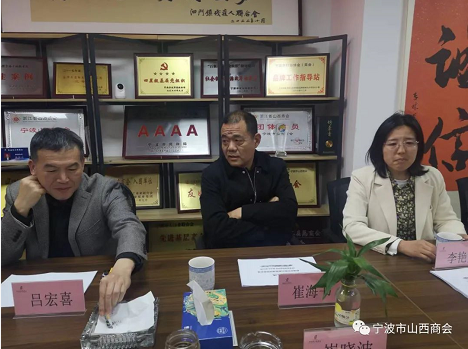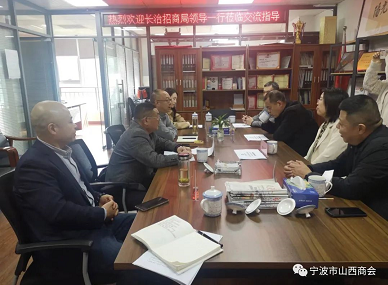3月2号下午,山西省长治市招商局领导莅临宁波市山西商会(晋商俱乐部联合发起机构)座谈交流,与商会会员企业、在甬老乡企业对接洽谈,参加此次座谈交流的有:长治市招商中心副主任崔海书、科长吕宏喜、屯留区招商中心副主任李艳芳、长子县招商中心副主任李鹏、商会理事杨新社、老乡苗红伟、郭玉婷、李岩庆;秘书长崔晓波及秘书处工作人员等。