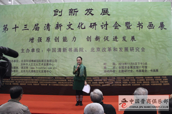 2016年11月5日下午,“创新发展”第十三届清新文化研讨会暨书画展在北京举行。本次活动是由中国清新书画院、北京发展和改革研究会等单位主办,北京凡凡清新文化发展中心承办,吉林市人文文化艺术发展中心、北京环球博威国际展览有限公司、和裕书院协办的文化盛会。通过开展学术研讨、书画展、书画笔会等活动,弘扬创新精神和清新风气,继承传统艺术的基础上增强艺术家的原创能力,展示当代杰出中国书画家和艺术家对清新艺术风格的追求及其艺术成就和创新成果,体现了他们在弘扬优秀传统文化、弘扬真善美和正气的社会担当责任。