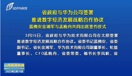 3月15日,山西省政府与华为技术有限公司在太原签署推进数字经济发展战略合作协议。省委书记蓝佛安,省委副书记、省长金湘军,华为技术有限公司副董事长、轮值董事长、CFO孟晚舟,省委常委、秘书长李凤岐,省委常委、太原市委书记韦韬出席签约仪式。省委常委、常务副省长吴伟,华为公司高级副总裁、煤矿军团董事长邹志磊签约。
