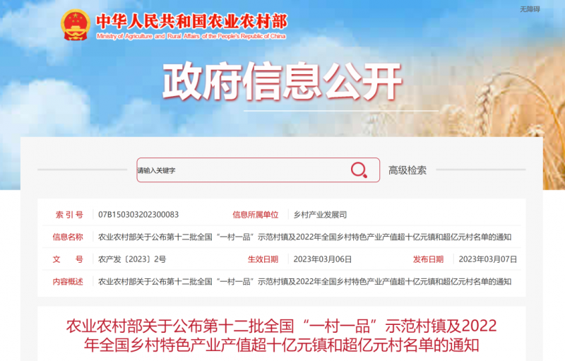 日前,农业农村部官网公布了395个第十二批全国“一村一品”示范村镇,199个2022年全国乡村特色产业产值超十亿元镇,306个2022年全国乡村特色产业产值超亿元村名单。