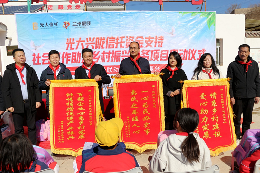 3月13日,光大信托以慈善信托支持旋马滩村留守儿童项目启动仪式在甘肃省榆中县马坡乡旋马滩村村委广场举行,公司研究总监翟亮,慈善办主任乔方亮现场参加启动仪式。兰州市民政局党组成员、副局长王垚,兰州市民政局慈社科长孙天平,儿童福利科长张晓岚,马坡乡政府武装部长刘伟清,旋马滩村社留守儿童,部分村民代表参加了启动仪式。