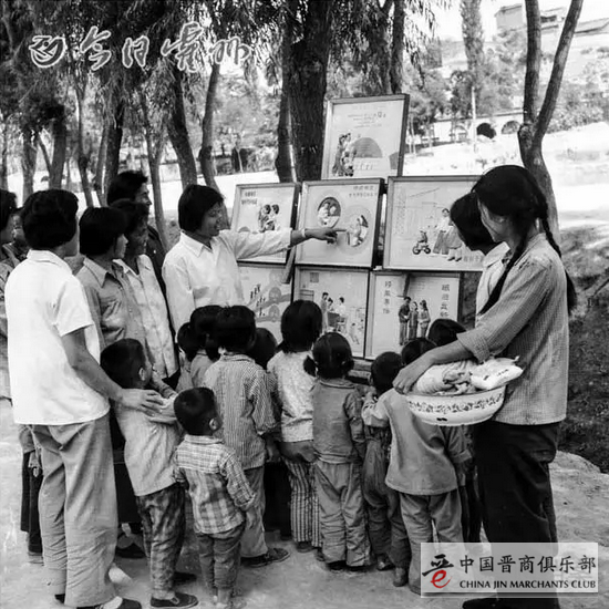 1982年大张堰前,群众正在观看计划生育宣传版面
