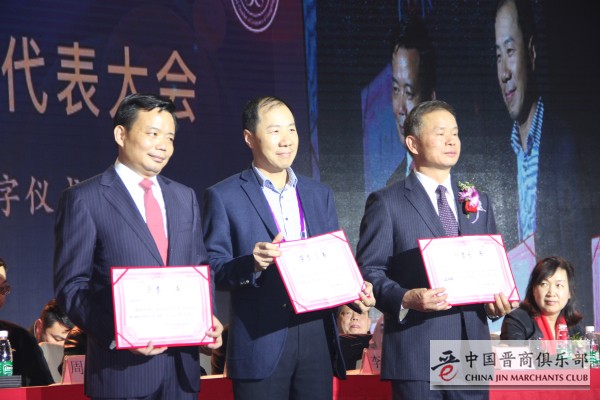 广东省政府副秘书长、省驻京办主任周德全为山西省广东商会终身荣誉会长陈浪华、山西省广东商会会长曾建新、山西省广东商会常务副会长蔡懿壮三位优秀新晋商颁发了“爱心公益大使”证书。
