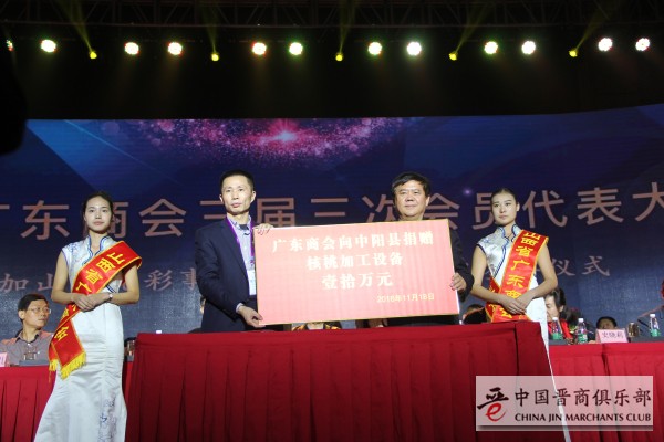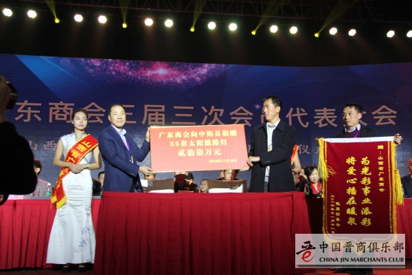 山西省委统战部副巡视员、山西省委驻中阳县扶贫工作大队长、中阳县委副书记张云虎为山西省广东商会颁发荣誉证书。