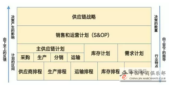 在供应链管理的关键流程中,从上至下的指导,以及从下至上的反馈。图片越上面,决策产生的影响越大,计划的区间越长。图片越下面,决策的数量越大,行业特点越多。