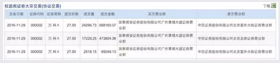 根据深交所大宗交易数据,当天国泰君安证券股份有限公司广州黄埔大道证券营业部累计买入万科A44044万股,约占万科总股本的4%,成交价格27.50元,成交金额121万元。卖方营业部为中信证券北京复外大街证券营业部和中信证券北京总部证券营业部。当天,万科A收报26.16元,下跌0.83%。