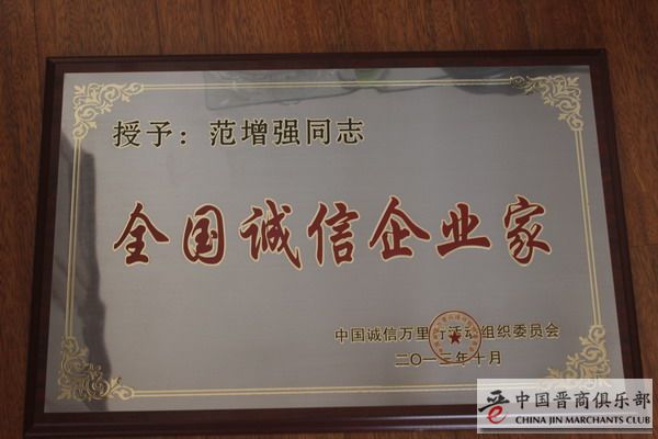 范增强被”全国诚信万里行组委会“授予”全国诚信企业家“荣誉称号