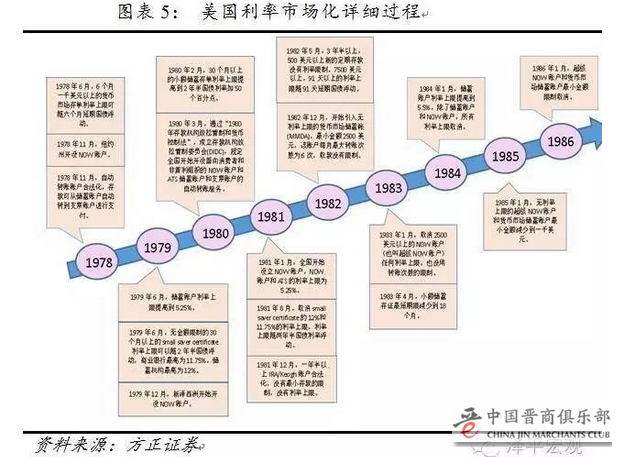 1978年,美联储规定银行发行6个月定期存款(CD),而其利率则受制于每周国债拍卖市场价格。虽然当时的CD产品存在最低限额的门槛,但存款机构的资金仍大量流入到这些监管较松的CD产品之中。其后,也在资金脱媒化的倒逼之下,美国陆续实施了“1980年存款机构放松管制以及货币控制法”、“1982年存款机构法”、“Q条例”等促成利率市场化的政策,逐步放松自动转账服务(ATS)账户、小额储蓄存单、NOW账户、货币市场储蓄账户的利率管制,直到1986年3月,客户存款利率管制被完全取消。