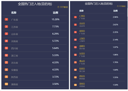 更值得关注的是,广东有四个城市位列人口迁入TOP10,分别是:广州、深圳、东莞、佛山。(数据来源:百度迁徙)